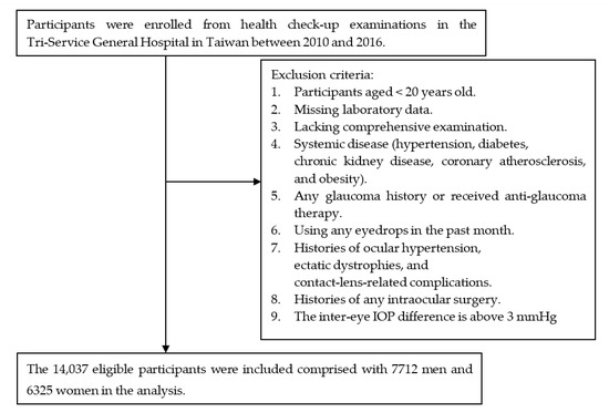 We collected the medical records of healthy examinations including laboratory examinations, ophthalmological examinations, body composition, and self-reported questionnaires between 2010 and 2016 in a medical center, the Tri-Service General Hospital (TSGH) in Taiwan. Only participants over 20 years old were included in this study. This was a retrospective study to determine the association of IOP with serum total calcium levels. Our exclusion criteria were as follows: missing laboratory data; those lacking comprehensive examinations; any systemic disease that could affect the IOP and homeostasis of serum calcium (hypertension, diabetes, chronic kidney disease, coronary atherosclerosis, and obesity); any glaucoma history or having received anti-glaucoma therapy; using any eyedrops in the past month; histories of ocular hypertension, ectatic dystrophies, and contact-lens-related complications; histories of any intraocular surgery; and an inter-eye IOP difference above 3 mmHg [14]. If the participants received more than one healthy examination during this period, we only selected the data at the first visit to analyze. Finally, 14,037 eligible participants, consisting of 7712 men and 6325 women, were included in the analysis (Figure 1). The study was conducted in accordance with the principles of the Declaration of Helsinki, and it received institutional review board approval from TSGH.
