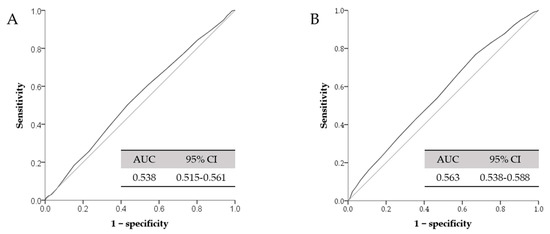 We also performed the logistic regression to examine the association between different serum total calcium tertiles and high IOP and the result is demonstrated in Table 4. In the female population, the risk of high IOP was significantly associated with the higher tertiles of serum total calcium levels in Model 1 (odds ratio = 1.599, 95% confidence interval = 1.171–2.184, p = 0.003), Model 2 (odds ratio = 1.522, 95% confidence interval = 1.105–2.097, p = 0.010), and Model 3 (odds ratio = 1.539, 95% confidence interval = 1.116–2.122, p = 0.008). However, the odds ratios between serum total calcium and high IOP were not significant in the male group. Figure 2 summarizes the optimal cut-off value of serum total calcium by using ROC analysis. The AUROC value was 0.538 (95% confidence interval = 0.515–0.561) in the male group and 0.563 (95% confidence interval = 0.538–0.588) in the female group. The odds ratios for developing high IOP (>18 mmHg) in different models are showed in Table 5. The optimal cut-off value of serum total calcium level was 9.35 mg/dL in the male group by using maximal Youden’s index with sensitivity and specificity (50.4/56.5%). Likewise, the optimal cut-off value of serum total calcium level was 9.05 mg/dL in the female group with sensitivity and specificity (76.8/33.0%). We found the significant occurrence of high IOP in the cut-off value in the female group. In contrast, there was no significant difference in the cut-off value in the male group.