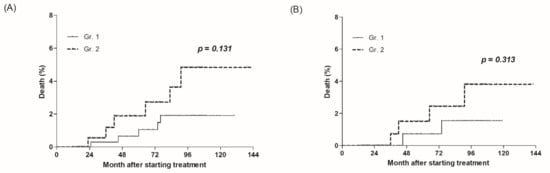 A total of 11 deaths occurred during the median follow-up period of 86 months (IQR, 35–94). There were 5 of 397 (1.3%) and 6 of 213 (2.8%) deaths in Gr.1 and Gr.2, respectively (p = 0.131) (Figure 1A).
