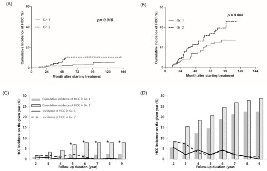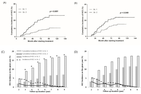 The cumulative incidence of HCC at the 2 years after treatment were 2.0% and 4.7% in Gr.1 and Gr.2, respectively. Although it was not a significant difference until this time point (p = 0.062), the difference between the two groups has been significant since 2 years. The cumulative HCC incidence of Gr.1 and Gr.2 were 4.8% and 13.6% at 5 years (p = 0.001), 6.8% and 16.9% at 8 years, respectively (p < 0.001) (Figure 2C). In the Figure 2C,D and Figure 3C,D, the solid and dotted lines show the HCC incidence at each of time points, and the columns show the cumulative incidences. The columns at the time when significant differences were observed are marked with stars (*). The cumulative incidence of HCC estimated by the Kaplan–Meier method was significantly lower in Gr.1 than Gr.2. (p < 0.001) (Figure 2A).