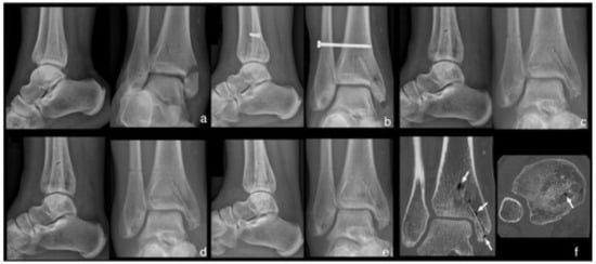 (a) Anteroposterior and lateral ankle radiographs of a 49-year-old female patient with medial malleolar fracture treated with Mg-based screws. (b) After 2 weeks: visible fracture line at the medial malleolus associated with small signs of radiolucent zones within the bone surrounding the screws. (c) After 6 weeks: fracture consolidation with increase of radiolucent zones within the bone surrounding the screws. (d) After 12 weeks, and (e) After 24 weeks: constant and non-evolutive radiolucent zones. (f) CT scan at 52 weeks, decrease of radiolucent zones, increased endosteal bone mass, and periosteal bone ingrowth at the screw head (white arrow). Reproduced from [108].