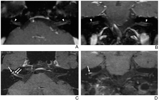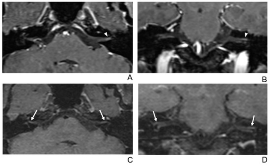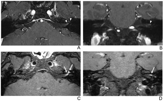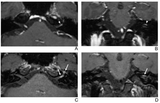 A 39-year-old male patient with left facial neuritis. (A–D) Paired axial and coronal CE-GRE (A,B) and T1 BB-FSE (C,D) images of the same patient. The left distal canalicular segment of the facial nerve showed asymmetric, intense enhancement in the axial (A) and coronal (B) CE-GRE images (arrowheads). In contrast, the labyrinthine segment showed no definite enhancement, and the anterior genu segment showed moderate degree enhancement and was interpreted by reviewers 1 and 2 as left facial neuritis (2, diagnostic confidence; 3, 0, and 2, visual grades for contrast enhancement (CE) in the canalicular, labyrinthine, and anterior genu segments, respectively). The left facial nerve shows asymmetric intense enhancement in the canalicular, labyrinthine, and anterior genu segments in the axial (C) and coronal (D) T1 BB-FSE images (arrows); it was evaluated by reviewers 1 and 2 as left facial neuritis (2, diagnostic confidence; 3, 2, and 3, visual grades for CE in the canalicular, labyrinthine, and anterior genu segments, respectively). Compared to the CE-GRE images shown earlier, in the T1 BB-FSE image, it can be seen that the contrast-enhanced area in each segment of the facial nerve is longer and wider.