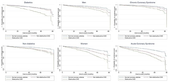 Table 3, Figure 1, and Figure 2 present the associations of degree of CAD with the risk of cardiovascular event. In the total population, the adjusted Cox proportional hazard models showed that the non-obstructive CAD and obstructive CAD participants presented a significantly higher risk of developing cardiovascular events than those with normal coronary arteries (Hazard Ratio (HR) = 1.72, 95% CI: 1.23–2.39 and HR = 2.71, 95% CI: 2.03–3.62 respectively; p for trend <0.001). In the stratified analysis for diabetes, sex, and indication for angiography (Table 3 and Figure 2), a direct relationship could still be observed between the severity of CAD and the risk of a cardiovascular event (p for trend <0.001 in all of the models). However, in comparing the non-obstructive CAD group of patients to patients with normal coronary arteries, a higher risk of cardiovascular event was only found for non-diabetics (HR = 2.12, 95% CI: 1.40–3.22), women (HR = 1.75, 95% CI:1.10–2.77), and patients with ACS (HR = 2.07, 95%: 1.25–3.44).