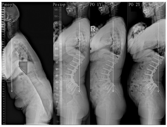 - Lee, K.Y.; Lee, J.H.; Kang, K.C.; Shin, S.J.; Shin, W.J.; Im, S.K.; Park, M.S. Minimally invasive multilevel lateral lumbar interbody fusion with posterior column osteotomy compared with pedicle subtraction osteotomy for adult spinal deformity. Spine J. 2020, 20, 925–933. [Google Scholar] [CrossRef]