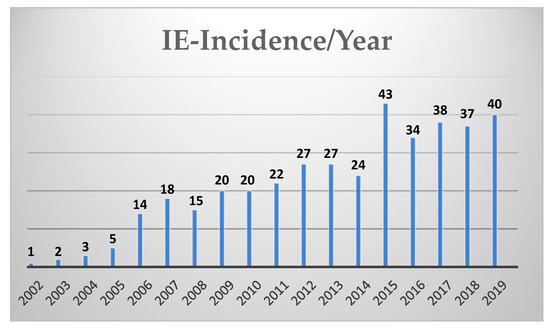 Analysis of the demographic and preoperative status showed that INVE present in 242 patients (59%) without history of previous cardiac surgery while 171 patients (41%) underwent surgery due to IPVE. Patient with IPVE were significantly older than patients with INVE (64.9 ± 13.2 years vs. 58.3 ± 15.5 years; p < 0.001) with higher percentage of patients older than 70 years (77 (45.0%) years vs. 60 (24.8%) years; p < 0.001)). EuroSCORE II was significantly higher among IPVE group (21.2 (12.7; 41.8) vs. 6.9 (3.0; 17.0); p < 0.001)). Those patients suffered more significantly from coronary heart disease (50.6% vs. 38.0%; p < 0.011), poorer LVEF under 30% (24 (14.9%) vs. 17 (7.4%) years; p = 0.017)) and arterial hypertension (1 29 (75.4%) vs. 111 (45.9%); p < 0.001). The incidence of infective endocarditis that required surgical intervention increased yearly. Figure 1 represents the course of IE over the last 18 years.