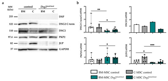 Cardiac and bone marrow mesenchymal stromal cells express desmosomal proteins, whose profile changes in the AC background. (a) Western blotting on protein extracts from cultured cardiac- and BM-MSCs, isolated from either control or Dsg2mut/mut adult male mice. GAPDH was used to ensure equal protein loading. MW, molecular weight. DSP, desmoplakin; DSG2, desmoglein-2; DSC2, desmocollin-2; PKP2, plakophilin-2; JUP, plakoglobin. (b) Densitometric analyses of the WB in (a). A total of 4 samples for each group were analyzed. Three independent experiments were performed, with the exception of DSC2. In the graph of JUP, bars represent mean, and error bars represent the relative standard deviation (SD). In the others, bars represent median, and error bars represent the limits of 95% confidence interval (CI). * p ≤ 0.05; ** p ≤ 0.01; *** p ≤ 0.001.