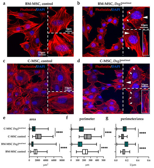 To assess how Dsg2-linked AC impacts on MSCs, we first compared the morphologic features of cells isolated from either the heart or BM of adult control and AC mice. At a first inspection with bright-field microscopy, we noticed that the AC mutant population included numerous grossly rounded and less frequent spindle-shaped cells, compared with controls, with a decrease in dimension. Based on the well-accepted role of the cytoskeletal dynamics and organization in determining cell shape, spreading, and stiffness, which eventually affect cell differentiation [22], and on the role of DSG2 in regulating actin assembly [23,24,25], cells were initially analyzed with confocal microscopy upon incubation with AlexaFLUOR®-568 conjugated phalloidin (see Supplementary Methods) to determine the distribution of intermediate filaments. Our analysis revealed that in the vast majority of Dsg2mut/mut cells, the actin cytoskeleton—which in control cells, displayed an abundant number of thin, parallel microfilament bundles, extending across the entire cytoplasm—was dramatically different (Figure 2a–d). In fact, both Dsg2mut/mut BM- and cardiac- MSCs showed alterations in actin distribution, characterized by the presence of cytoplasmic regions devoid of organized filaments with fluorescent puncta, regions occupied by thick actin filament bundles, predominantly located at the outermost cell periphery, and membrane localized focal adhesions, all of which reminisce actin stress fibers and suggest alterations in microfilament dynamics (Figure 2a–d). In addition, both BM- and cardiac- AC cells were smaller in size (surface area, BM-MSC, Dsg2mut/mut: 938.8 ± 824.5 vs. control: 1611 ± 676; C-MSC, Dsg2mut/mut: 1157 ± 709.3 vs. control: 2330 ± 1138, in μm2), had a significantly shorter perimeter (BM-MSC, Dsg2mut/mut: 150.9 ± 69.34 vs. control: 220.1 ± 61.62; C-MSC, Dsg2mut/mut: 162.3 ± 57.61 vs. control: 258 ± 74.99, in μm), and a higher perimeter/area ratio (BM-MSC, Dsg2mut/mut: 0.1921 ± 0.05787 vs. control: 0.1466 ± 0.03411; C-MSC: Dsg2mut/mut: 0.1638 ± 0.05423 vs. control: 0.1232 ± 0.03432) (Figure 2e–g). This latter result was used as an indicator of general modifications in the cell shape.