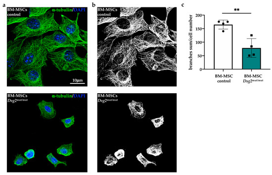 AC-linked Dsg2 variant affects microtubule organization in bone marrow mesenchymal stromal cells. (a) Super-resolution confocal IF analysis of cultured BM-MSCs isolated from control or Dsg2mut/mut mice. Cells were stained with anti-α-tubulin antibody (green signal). Nuclei were counterstained with DAPI (blue signal). (b) Skeletonized images shown in (a). (c) Quantification of total number of microtubule branches/cell in control and AC BM-MSCs. A total of 30 cells for each study group were analyzed. Bars represent mean, and error bars represent standard deviation (SD). ** p ≤ 0.01.