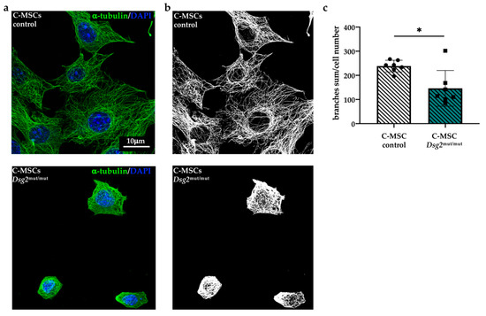 To gain additional details on cytoskeletal organization, we imaged microtubules in cultured cells stained with an anti-α-tubulin antibody. Analysis at confocal and super-resolution microscopy revealed that, in addition to microfilaments, the microtubule network was also altered in AC cells. Alpha-tubulin filaments, which had a regular distribution and covered most of the cell cytoplasm in control cells, appeared irregularly distributed, partially fragmented, and threaded around the cell nucleus in both BM-MSCs (Figure 3a,b) and C-MSCs (Figure 4a,b) (Supplementary Figure S4). Unbiased analysis of the total number of branches quantitated such qualitative alterations in the microtubular network, which appeared less branched in the AC cells (Figure 3c and Figure 4c). Taken altogether, our results, by confirming previous evidence on the role of DSG2 in regulating cytoskeleton of different cell types [22,23,24,25], indicate that the primary Dsg2 mutation may affect the biology of both cardiac- and BM-MSCs.