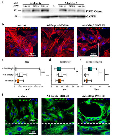 The results of the experiments described thus far suggest that the AC-linked Dsg2 variant impinges on the regulation of MSC cytoskeletal dynamics and function. To determine whether the AC cell phenotype is due to a deficiency in DSG2 protein level, as a result of Dsg2 mRNA-mediated degradation in Dsg2mut/mut mice [14,15], we conjectured that DSG2 downregulation would lead to the same alterations in normal rat BM-MSCs. To test this hypothesis, BM-MSCs were infected for 72 h with an adenoviral (Ad) vector encoding a short hairpin RNA (sh-RNA), which binds to Dsg2 mRNA and prevents protein translation. Rat cells were chosen for the abundance of material harvested from a single animal, which allowed reduction of the number of experimental animals used in this work. In addition, based on the similarity between mouse and rat BM-MSC desmosomal profile, we decided to verify our hypothesis in another species. Three days after infection, DSG2 protein levels were assessed by WB, confirming the expected reduction in DSG2 protein level, which was of similar extent in cells inoculated with either MOI 50 or 100 (85.1 ± 5.6 % reduction compared with controls, n = 3 independent experiments; p ≤ 0.01) (Figure 5a). We then analyzed with confocal microscopy, in phalloidin-labelled cells, the organization of actin intermediate filaments. As shown in Figure 5b, DSG2 reduction caused both actin filament remodeling and alterations in cell shape, which replicated the morphology of MSCs isolated from Dsg2mut/mut mice. In fact, DSG2-downregulated cells were smaller (surface area: Ad-shDsg2: 2362 ± 3327 vs. Ad-Empty: 5641 ± 2837, in μm2; perimeter: Ad-shDsg2: 290.8 ± 129.8 vs. Ad-Empty: 361.7 ± 109.1, in μm) (Figure 5c,d) and had a higher perimeter/area ratio (Ad-shDsg2: 0.1709 ± 0.06182 vs. Ad-Empty: 0.07346 ± 0.02321) (Figure 5e). In addition, Ad-shDsg2 cells showed alterations in the intracellular organization of microtubules, which were fragmented and threaded around the cell nucleus (Figure 5f), recapitulating the phenotype described in Dsg2mut/mut cells. Thus, these data identify the role of the sole reduction in DSG2 levels and unveil the previously neglected effect of DSG2 in BM-MSCs, supporting a causal link between AC-linked loss-of-function Dsg2 variant and altered cytoskeletal organization in MSCs.