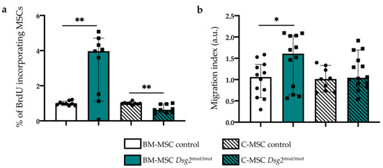 In light of the well-accepted role played by the microtubule and microfilament network in the regulation of cell proliferation and migration [22,23,24,25,26,27,28,29], the finding of altered cytoskeletal architecture in AC cells prompted us to verify whether the proliferative and migratory capacity of MSCs, harboring the Dsg2-variant, differed from controls. We thus estimated in vitro the proliferative index of AC vs. control MSCs, of either cardiac or BM origin, by performing a BrdU incorporation assay and measured the fractions of cells immunoreactive toward an anti-BrdU antibody via flow cytometry. While Dsg2mut/mut BM-MSCs showed increased proliferation rate compared with control cells, C-MSCs displayed, conversely, lower BrdU incorporation (Figure 6a). Subsequently, we used a Transwell assay to compare the cell motility capacity of the different cell types. In basal conditions, Dsg2mut/mut BM-derived cells displayed increased migratory behavior (Figure 6b), which increased at a level comparable with that of control cells, in the presence of FBS (not shown), to evoke the maximal migratory stimulation. Such differences were not detected in C-MSCs from both genotypes, which showed a comparable migratory capacity, both in basal and stimulated conditions (Figure 6b).