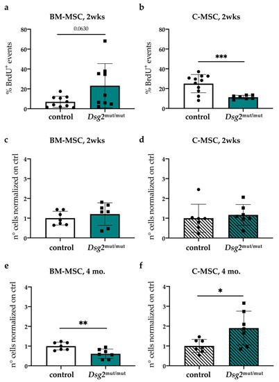BM-MSCs were isolated from 2-week-old and 4-month-old Dsg2mut/mut mice and age- and sex-matched littermate controls, using the protocol described in Angioni et al. [18]. BM-MSCs were selected based on adherence to plastic and were screened by flow cytometry, according to Dominici et al. [17].