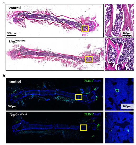 Hematoxylin-eosin staining and IF analysis with anti-perilipin-1 (PLIN1) antibody ruled out that such a finding depended on structural alterations in the BM of adult Dsg2mut/mut mice (e.g., fatty accumulation), which could lead to depauperation of MSC niches (Figure 8).