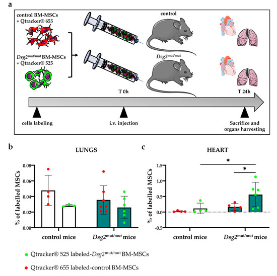 Our results showing that the reverse changes in the BM and heart MSC content during AC progression, together with the evidence that BM cells actively contribute to heart remodeling in different disease conditions [30,31], guided the hypothesis that engraftment of BM-derived MSCs could play a role in myocardial remodeling in Dsg2mut/mut mice. We thus set out to quantify myocardial infiltration by MSCs and to determine whether it was dependent on heart damage, or if the cell intrinsic properties of Dsg2mut/mut MSCs could play a role. To this aim, we performed a ‘competitive’ homing assay, in which a balanced mixture of control and Dsg2mut/mut BM-MSCs, isolated from adult mice, were labelled in vitro with 655 nm and 525 nm emitting fluorescent Qtrackers® [Thermo Fischer Scientific, Waltham, MA, USA], respectively, and then injected intravenously (i.v.) in adult control and Dsg2mut/mut mice. Labelling was very efficient, as more than 95% of cells were positively colored before injection (Supplementary Figure S6). After 24 h, mice were euthanized and lungs (which are known to accumulate cells injected i.v. as result of pulmonary first-pass) [32], liver, spleen, and heart were collected (Figure 9a). Organs were minced and enzymatically digested to obtain a single cell suspension, which was further processed with flow cytometry. There were no genotype-dependent differences in MSC accumulation in the lungs (Figure 9b) and liver, which showed that all animals received similar amounts of labeled cells; there was only a moderate decrease in MSC in the spleen of AC mice. However, AC hearts had increased MSC accumulation than controls (Figure 9c), and remarkably, the majority of infiltrating cells originated from the Dsg2mut/mut pool. These differences were not artifactual, as shown by the same results obtained upon injection of the mixture of control and AC BM-MSCs, labelled with inverted colors (655 nm Dsg2 mutant vs. 525 nm control cells).