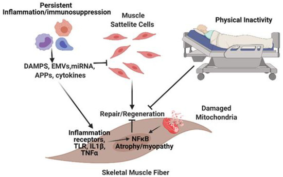 Another factor that determines the fate of muscle function in sepsis is mitochondrial status. In whole muscle, mitochondrial dysfunction can drive persistent intrinsic tissue inflammation, loss of muscle mass, and loss of force production after sepsis [35]. The breakdown of mitochondria is associated with an elevated release of mitochondrial degradation products and other DAMPs that can interact with receptors to stimulate inflammatory pathways and cytokine secretion in surrounding cells [36]. It is likely that alterations in muscle metabolism that occur during sepsis are involved in other aspects of the myopathy, such as SC dysfunction, which results in an impaired capacity to regenerate and repair the muscle tissue (Figure 1).