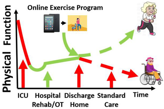Studies have shown that a 12-week multi-modal home-based intervention including cognitive and physical rehabilitation in middle-aged (41–59 years old) critical illness survivors (25% sepsis patients) was feasible and effective in improving physical and cognitive outcomes [69]. They also found that 92% of patients began an intervention upon discharge from the hospital to their home [69]. Approximately 26% of older patients are discharged directly home from the ICU, and 48% receive home care [10]. In the general SNF rehabilitation population, the large majority of patients achieve clinically meaningful changes in physical performance (87%) and gait speed (78%) [70]; however, patients are at risk of developing problems once discharged home, including loss of function, falls, and hospital readmissions [71,72]. Following in-patient geriatric rehabilitation, patients walk slower and for significantly shorter distances when at home, underscoring the need to help individuals increase the intensity of their activity gained by discharge [73]. While a proportion of patients may receive home-based therapy after discharge from the hospital, these sessions amount to ~1 h/week and often address other domains of disability, such as activities of daily living (ADL) [74]. Sadly, most older patients who go home demonstrate major health impairments, lead sedentary lifestyles, and often live far away from medical and research institutions, and thus are unable to join structured physical activity programs [18]. Currently, no practical approach exists to improve sepsis survivors’ health status and physical function once they return home.