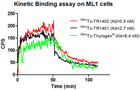 Real-time kinetic binding assay on ML1 cells with 99mTc-TR1402 (red line), 99mTc-TR1401 (black line), and 99mTc-Thyrogen (green line). Highest affinity was detected for 99mTc-TR1402.