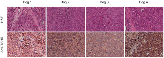 Histological section of excised lesion from the 4 dogs stained with hematoxylin/eosin (top panels), revealing a solid/trabecular follicular thyroid carcinoma (200× magnification). Histological section stained with an anti-dog-TSHR antibody reveals homogeneous staining in almost all cancer cells (bottom panels).