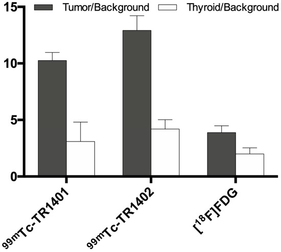 No focal uptake was found either in the regional lymph nodes or in other tissues, but in the liver and kidneys as a consequence of radiopharmaceutical metabolism. 99mTc-TR1402 always showed more intense uptake than 99mTc-TR1401. [18F]FDG uptake in tumors was of variable degree and distribution, not always matching with intratumoral distribution of labelled superagonists (Figure 3 and Figure 4). Radiolabeled TR1402 showed the highest T/B ratio in tumors compared with TR1401 or [18F]FDG (12.9 ± 1.3, 10.2 ± 0.7, and 3.8 ± 0.6, respectively; all p < 0.001), but not significantly different T/B in the contralateral thyroid lobe (4.2 ± 0.8, 3.1 ± 1.7, and 1.9 ± 0.5, respectively) (Figure 5).