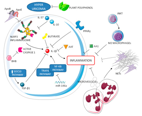 Other anti-inflammatory cytokines (e.g., IL-10 and IL-37) have a key role in the resolution phase. IL-37, in particular, suppresses multiple innate inflammatory responses in vitro and in vivo, acting partially via inhibition of the NLRP3 inflammasome [27]. Other endogenous molecules involved in the disease self-limitation are lipoproteins ApoE and ApoB, a hormone receptor perixosome proliferator-activated receptor y (PPARy), a ketone body b-hydroxybutyrate (BHB), and an inhibitor of serine proteases α1-anti trypsin (AAT). Concerning lipoproteins, it has been reported that changes in the lipoproteins coating MSU crystals and their concentration in synovial fluid play an integral role in the self-limiting nature of an acute attack [31,32]. Both PPARy and BHB have been reported to reduce or inhibit the production of IL-1β [33,34]. It was also shown in a murine model that AAT blocked IL-1β production after MSU stimulation. Interestingly, AAT concentration and IL-1β production are linked to seasonality, since low AAT and high IL-1β levels are observed during gouty peaks in the spring and summer. Moreover, recent data demonstrate a rhythmic regulation of NLRP3 inflammasome expression and activation, linking the circadian clock to inflammatory resolution [35].