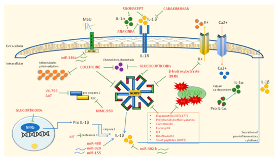 Inhibitory drugs (in red) of autoinflammatory mechanisms in gouty inflammation. Blue arrows indicate mechanisms of activation (i.e., maturation of IL-1α and IL-1β from precursors or the ability of miR-488 and miR-920 to induce the production of IL-1β). Green connectors identify inhibitory mechanisms towards NLRP3 or IL-1 processing.