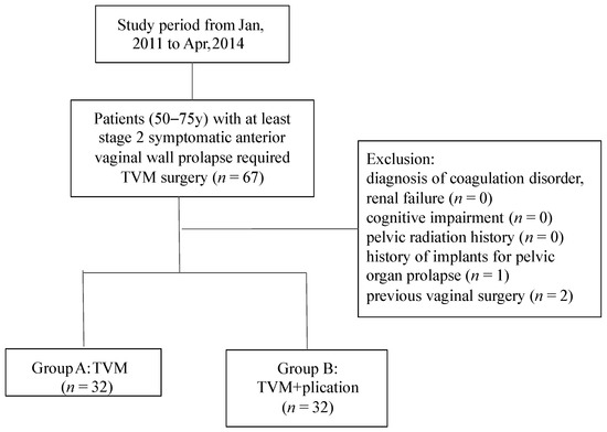 Having 32 patients in each group (estimated point Ba improved 4.0 cm in the TVM alone group and 4.8 cm in the TVM + plication group) would provide the trial with 80% power, at a two-sided significance level of 0.05. Data are presented as the mean ± standard deviation (SD) or number/percent (n (%)). The Mann–Whitney U test or unpaired t test was used to compare two independent variables, and the Chi-square test was used to compare outcomes six and 12 months postoperatively. Fisher’s exact test was used to test categorical variables. Statistical analysis was performed using GraphPad Prism 6 (GraphPad Software, San Diego, CA, USA). p < 0.05 was considered statistically significant.