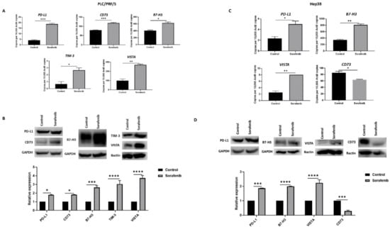 We also evaluated the effects of Sorafenib treatment on immune checkpoint molecule expression in HCC cells. In PLC/PRF/5, Sorafenib treatment resulted in upregulation of immune checkpoints PD-L1 or CD274, CD73 or NT5E, B7-H3 or CD276, VISTA or VSIR, and TIM-3 or HAVCR2, as demonstrated by qRT-PCR (Figure 2A) and western blot analysis (Figure 2B). Similarly, Hep3B cells displayed elevated expression of PD-L1, B7-H3, and VISTA and decreased expression of CD73, as revealed by qRT-PCR (Figure 3C) and western blot (Figure 3D). However, Hep3B cells did not express TIM-3.