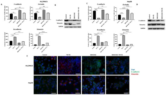 SB431542 inhibits TGF-β1-mediated EMT in HCC cells. (A) qRT-PCR revealed an increase in E-cadherin and Occludin and a decrease in N-cadherin and Vimentin expression and (B) western blot showed an increase in E-cadherin and reduction in Vimentin following TGF-β1 and SB431542 treatments compared with cells treated with TGF-β1 alone in PLC/PRF/5 cells. GAPDH was used as the loading control. (C) qRT-PCR revealed increased expression of E-cadherin and Occludin and lower expression of N-cadherin and Vimentin and (D) western blot analysis demonstrated higher expression of E-cadherin and lower expression of Vimentin following treatment with TGF-β1 and SB431542 in Hep3B cells. GAPDH was used as the loading control. (E) Fluorescence microscopy demonstrated upregulation of E-cadherin and downregulation of Vimentin in cells treated with TGF-β1 and SB431542 compared with cells treated with TGF-β1 alone in both PLC/PRF/5 and Hep3B cells (scale bar = 200 µm) (n = 3, ** p < 0.01, *** p < 0.005, **** p < 0.001, ns: not significant).