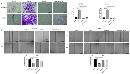 Furthermore, the functional motility assays revealed that SB431542 can effectively inhibit TGF-β-mediated motility in both HCC cells lines (Figure 4A,B).