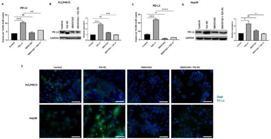 In our previous study, we observed that TGF-β1 driven EMT coincides with the upregulation of PD-L1expression in HCC cells (Manuscript in press). We thus utilised SB431542 treatment to assess whether blocking TGF-β1-induced EMT had any impact on PD-L1 expression. Reduced expression of PD-L1 was observed following SB431542 treatment in PLC/PRF/5 (Figure 5A,B) and Hep3B (Figure 5C,D) cells exposed to TGF-β1, as demonstrated by qRT-PCR and western blot analysis. Fluorescence microscopy further confirmed the downregulation of TGF-β1-mediated PD-L1 expression following treatment with SB431542 in both PLC/PRF/5 and Hep3B cells (Figure 5E).