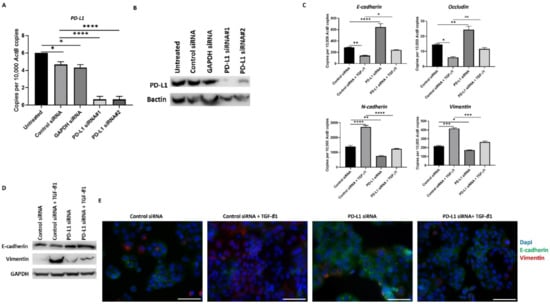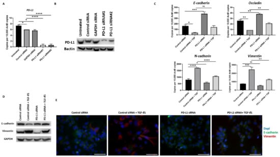 To further confirm the relationship between TGF-β1-induced EMT and expression of PD-L1, we knockdown the expression of PD-L1 with two different siRNAs in HCC cells. We confirmed the effective knockdown of PD-L1 with both the siRNAs tested by qRT-PCR and western blot analysis in PLC/PRF/5 (Figure 6A,B). Furthermore, we observed the reversal of TGF-β1-induced EMT following PD-L1 knockdown, evidenced by the reversal of both epithelial and mesenchymal marker expression in PLC/PRF/5 cells, as demonstrated by qRT-PCR (Figure 6C), western blot analysis (Figure 6D), and immunofluorescence staining (Figure 6E) after treatment of TGF-β1 and PD-L1 siRNA in combination.