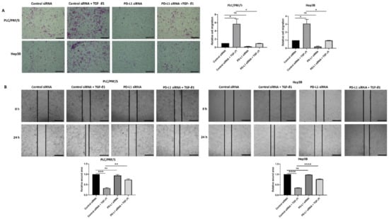 In addition, the migratory ability of cells was significantly reduced upon knockdown of PD-L1 in both HCC cell lines treated with TGF-β1 as demonstrated by transwell migration (Figure 8A) and wound healing assays (Figure 8B).