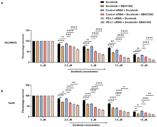 Next, we combined PD-L1 silencing and SB431542 along with Sorafenib treatment to HCC cells to examine if combined targeting of EMT and PD-L1 can overcome resistance to Sorafenib in HCC cells. At increasing concentrations of Sorafenib, the cell viability assay demonstrated that combination of knockdown of PD-L1 and SB431542 enhanced the cytotoxicity of Sorafenib in HCC cells when compared to treatment with Sorafenib alone or with either SB431542 or PD-L1 siRNA combined with Sorafenib treatment in both HCC cell lines (Figure 9A,B). This confirmed that combined targeting of EMT and PD-L1 has the potential to re-sensitise HCC cells to Sorafenib treatment.