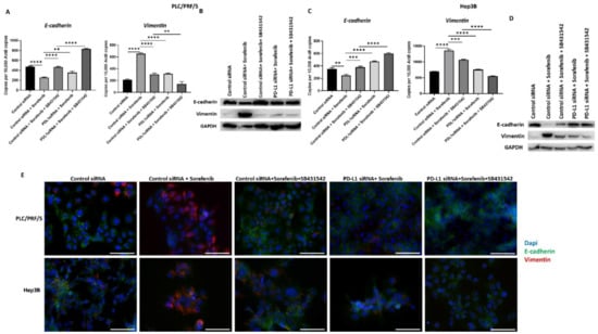 To confirm that combining PD-L1 silencing with SB431542 along with Sorafenib can result in less aggressive HCC cells, we assessed the expression of EMT markers and PD-L1 following combination treatment. We observed that the Sorafenib-induced EMT effects on HCC cells are reversed following combination treatment with PD-L1 knockdown and SB431542, as evidenced by qRT-PCR and western blot in PLC/PRF/5 (Figure 10A,B) and Hep3B (Figure 10C,D) cells. These results were further confirmed by fluorescence microscopy in both PLC/PRF/5 and Hep3B cells (Figure 9E).