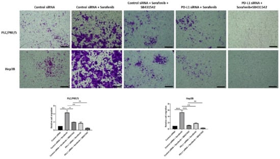 Combination treatment of Sorafenib with PD-L1 knockdown and SB431542 can reverse Sorafenib-induced migration in HCC cells. Migratory ability of PLC/PRF/5 and Hep3B cells was attenuated by combination treatment of Sorafenib with PD-L1 knockdown and SB431542, as revealed by images of the transwell migration assay (scale bar = 500 µm). The number of motile cells was determined by measuring the absorbance of Crystal Violet staining (n = 3, * p < 0.05, ** p < 0.01, *** p < 0.005).