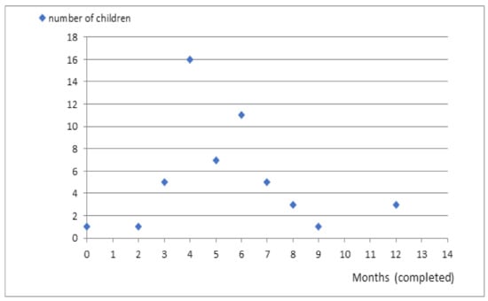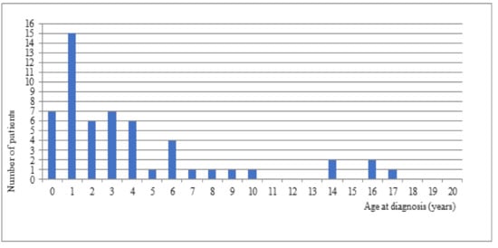 A very interesting conclusion was found in a retrospective study of patients with epileptic seizures and the SCN1A gene mutation. According to Nabbout et al. [], in the group of 20 patients (12 girls, 8 boys) the mean age at diagnosis was 2 years and 10 months. The results varied from country to country (Italy—1 year 1 month, Australia—2 years, Great Britain—4 years 2 months, and the USA—5 years). Cetica et al. [] showed that the age of onset of seizures could lead to the diagnosis of DS. The risk of DS was 85% in patients with first seizures (generalized tonic-clonic—71%, partial seizures—19%, myoclonic seizures—4%) before 6 months of age, 51% at 6–12 months, and 0% after 12 months. In their study, Gataullina et al. [] also indicated that the first seizures (i.e., tonic-clonic, or partial) occurred in the first year of life, usually between 4 and 8 months of age. The diagnosis of DS can be made according to the criteria [] proposed by epileptologists who together with parents (members of the American Dravet Syndrome Foundation) developed a consensus to facilitate the diagnosis of DS based on 9 clinical features, including the characteristic onset of tonic-clonic or partial seizures during the first year of life. In our study of 55 DS patients, the maximum age at which the first seizure occurred was 12 months. In our study, 46 (83.63%) patients were diagnosed within the first 6 years of life, and 7 (18.9%) patients were diagnosed before 12 months of age. The mean age at diagnosis was 3.85 years. It is possible to compare the situation in Poland to other countries.