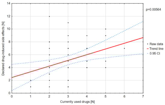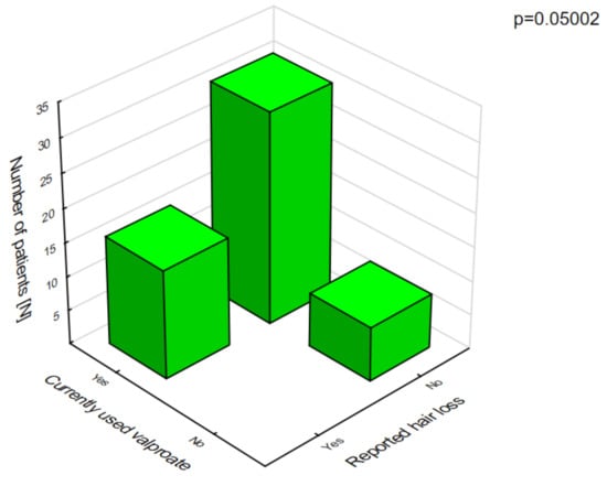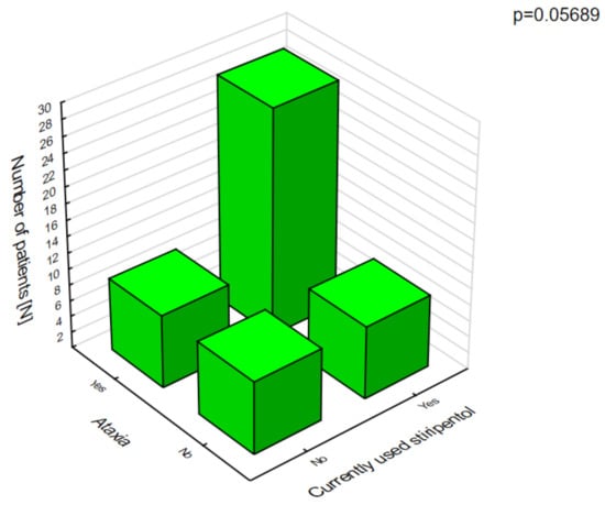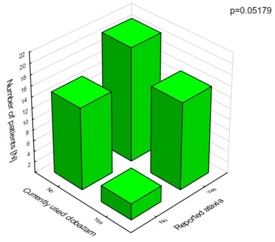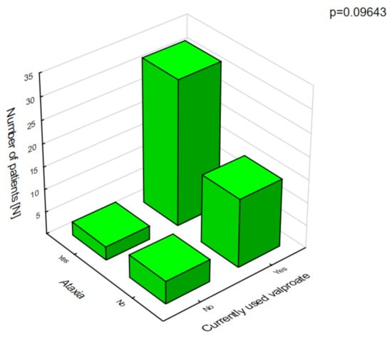 Polytherapy is a significant factor for the incidence of adverse effects and lowering the quality of life (Figure 3). The analysis of the adverse effects reported by the caregivers showed that different agents often had the same adverse effects, which may be related to their combination in therapy. Valproic acid was the most common drug in our patients with DS []. The most frequent adverse effects of this drug were associated with a statistically significant increase in ataxia (Figure 4) and hair loss (Figure 5).