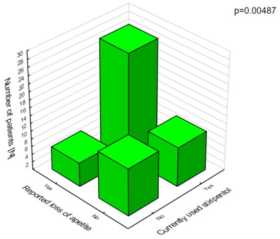Heger et al. [] in their study on the Norwegian population of 55 patients with DS also noted the problem of polytherapy and the resulting drug–drug interactions and indicated the three most commonly used drugs (i.e., valproic acid, clobazam and stiripentol), which could influence each other’s pharmacokinetics. Stiripentol is a potent inhibitor of hepatic enzymes and can displace valproic acid and clobazam from their protein binding sites, which results in increased drug concentrations in the blood and adverse effects such as ataxia or hair loss. Myers et al. identified the most commonly reported adverse effects in a 12-year follow-up study of 41 patients that evaluated the efficacy of stiripentol in reducing seizures and its combination in therapy with other drugs. [] Stiripentol was used in combination with valproic acid (71%) and clobazam (80%). The researchers reported anorexia nervosa and weight loss in 49% of patients compared to 60% of our patients affected with anorexia nervosa. Inoue et al. [] found that the most common adverse effects of stiripentol included drowsiness (39%) and loss of appetite (25%), which were significantly more common in our patients (40% and 60%, respectively). Chiron et al. [] in their study on the efficacy of stiripentol in 41 patients also reported similar adverse effects (loss of appetite, drowsiness) in 51% of patients on stiripentol, valproic acid, and clobazam. Additionally, these adverse effects resolved in 57% of patients after the dose of stiripentol was reduced. While dealing with the side effects of stiripentol, many of them are also due to valproic acid, because frequently these two drugs are used together (as in our study).