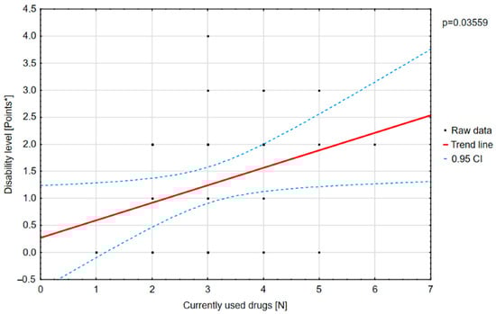 A positive correlation was found between the number of drugs and the degree of disability (Figure 10).