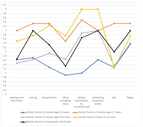 As many as 71.1% of patients experienced movement problems. In our study, parents also indicated in the PedsQL form that there were frequent or very frequent problems with performing more complicated movement activities. Based on the PedsQL form, the problem with walking and running increased with age. Conolly et al. [] indicated the occurrence of problems in the motor sphere, which exacerbated with age. Crouch gait is a significant problem, as indicated by many studies. Up to 50% of patients between 6 and 12 years of age are affected, whereas older patients are additionally affected by the symptoms of Parkinson disease, which significantly reduces the walking ability of DS patients. High prevalence of ataxia is an important issue that influence movement ability of DS patients. Our questionnaire showed that 65% of patients were affected with ataxia. Villas et al. [] showed that among 225 patients from various countries, 65% presented with ataxia, which was particularly severe in the younger children. Our findings are in line with these observations. Ataxia poses a risk of fall, hinders walking, and requires constant supervision by caregivers.