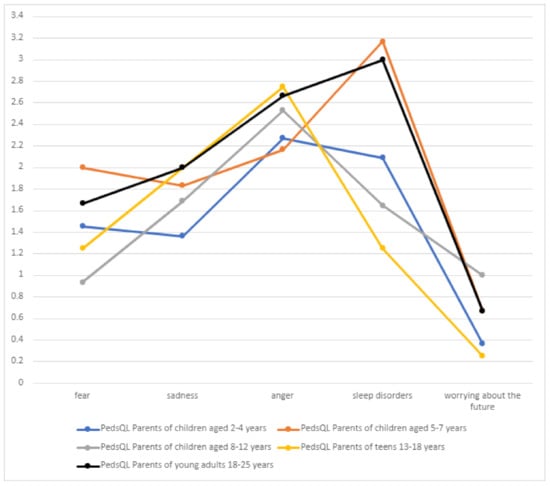 Significant problems related to the emotional sphere included the feeling of anger and sleeping problems, which are inextricably linked to DS and should be of interest to attending physicians (Table 6, Figure 12). Worrying about the future was the least frequent problem (mean score 0.589) in all patient groups, which may be due to the child’s age or intellectual disability.