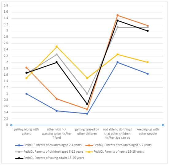 In terms of the social sphere, DS patients very often could not perform the activities their peers did in certain age groups (Table 7, Figure 13). Getting teased by other children was not a significant problem in the DS group, which may be due to the care provided by families and special facilities that the children attended. As in the case of the physical domain, a positive correlation was found between the number of treatment-related adverse effects and the score on the “social functioning” component of the PedsQL scale (p = 0.00536).