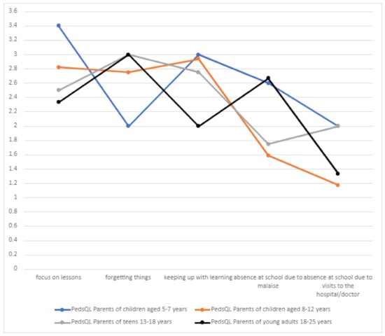 School functioning among patients was related to their present condition and individual skills. The main problems related to school functioning included the intellectual sphere (focusing on lessons, forgetting things, and keeping up with learning) (Table 8, Figure 14).