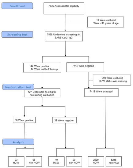 By the end of February 2020, the first reports about the serious situation at intensive care units in northern Italy emerged through social media. Austria, sharing a direct border to Italy, was among the first countries in Europe to initiate a nationwide lockdown. With approximately 8.9 million inhabitants, Austria′s healthcare system provides care to a population size comparable with a state in the US. The largest health insurance fund in Austria covers more than 7 million people and has approximately 12,000 employees. Within our organization, nearly 3700 healthcare workers (HCW) care for over 500,000 patients per year. During this first phase of the pandemic, healthcare services and processes were adapted to ensure patient and staff safety. Measures such as personal protective equipment (PPE), visitor restriction, isolation, and transfer of COVID-19 patients to dedicated COVID-19 hospitals, telemedicine-based outpatient services, and SARS-CoV-2 screening of non-COVID-19 patients prior to admission were implemented. Interestingly, the volume of patients dropped significantly from the very beginning of the pandemic, an observation that has also been made by other investigators [1,2]. Despite extensive infection control efforts, safety concerns may have led to patient’s change of care seeking behavior. Indeed, high COVID-19 infection rates have been reported among HCW from China and Italy [3,4]. Given the large numbers of asymptomatic or mild cases of SARS-CoV-2 infections [5], many of our HCW may have had undetected infections. Therefore, we assessed the prevalence of SARS-CoV-2 IgG antibodies among employees of the Austrian Health Insurance fund and compared HCW with non-HCW. These data provide the basis for resource management, strategic planning, and successful implementation of a COVID-19 vaccination program.