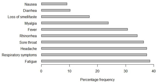 Percentage frequencies of common symptom reported by individuals with SARS-CoV-2 neutralizing antibodies.
