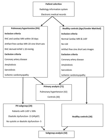 This is a single institution retrospective study approved by the local institutional review board. Patients were identified using a radiology information system and electronic medical records. Selection criteria for the PH group was as follows: right heart catheterization (RHC) and cMRI performed within thirty days of either exam, and availability of RHC derived mean pulmonary artery pressure and artifact-free balanced steady-state free precession (bSSFP) 2D short-axis cine cardiac MRI images. Patients with evidence of coronary artery disease, ischemic cardiomyopathy, or suspected infiltrative cardiomyopathy (like sarcoidosis or amyloidosis) on cMRI were then excluded. PH was defined based on RHC derived mean pulmonary artery pressure >20 mm Hg, founded on the recently proposed criteria and clinical classification []. Many patients had more than one cause of pulmonary hypertension (for example, lung disease and left heart failure). In these patients, the final class characterization of PH was based on a local multidisciplinary PH team discussion and recommendations. The patients in the PH group included all WHO classes of PH with the majority being from group 2. An age and gender-matched control group was retrospectively selected from patients who had undergone cMRI as part of a clinical work-up for a family history of cardiovascular disease, and a normal cMRI with normal biventricular ejection fraction and no delayed myocardial enhancement. Patients in the control group had no evidence of coronary artery disease, and no history of cardiac interventions including valve replacement or coronary interventions. Patients in the PH and control group were also screened for presence of comorbidities including diabetes mellitus, hypertension, and smoking. This yielded a total of 72 patients, 42 with PH and 30 controls. Primary extraction of texture features derived from cMRI of PH and controls subjects was performed in a consistent way for all the patients in both of the groups. To further analyze the texture features that may help differentiate the control group from PH patients with preserved LVEF, a subgroup analysis was also performed. This subgroup included patients from the PH group who had preserved left ventricle ejection fraction (LVEF) ≥ 50% [] and were compared against the controls. The subgroup of PH patients (20) with preserved LVEF included patients with an echocardiographic diagnosis of diastolic dysfunction (patients with heart failure with preserved ejection fraction (HFpEF)), and patients without evidence of systolic or diastolic dysfunction (Figure 1).
