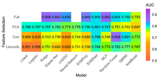 Feature selection was a critical piece of the model building process due to the large size of the feature set relative to the sample size. Feature reduction was performed to exclude irrelevant, redundant, duplicated, highly correlated features and to reduce data dimensionality and complexity. This was performed by using three feature selection methods: a linear combinations filter (lincomb), a high correlation filter (corr), and a principal components analysis (PCA). The linear combinations filter addressed both collinearity and dimension reduction by finding linear combinations of two or more features and removing columns until the feature set was full rank. The high correlation filter removed variables from the feature set which had a large absolute correlation. The number of components retained in the PCA transformation was determined by specifying the fraction of the total variance that should be covered by the components. The threshold for the largest allowable absolute correlation for the high correlation filter was set to 0.6, and for the fraction of total variance in the PCA transformation was set to 0.9. These thresholds were chosen to retain as much information as possible while providing enough dimension reduction to allow model fitting. Prior to any feature selection, all variables were standardized. These feature selection methods were implemented using the recipes package [] in software R version 4.0.2 (R Foundation for Statistical Computing, Vienna, Austria).