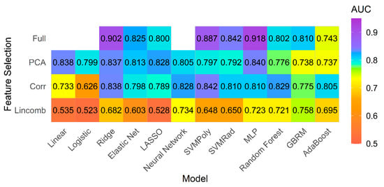 The best model performance was seen for the multilayer perceptron (MLP) network model classifier using the full feature set with cross-validated AUC 0.862 and accuracy of 78% (Figure 3).