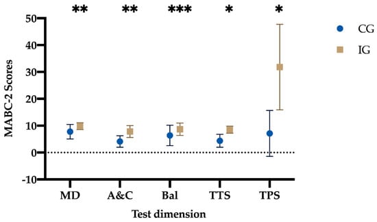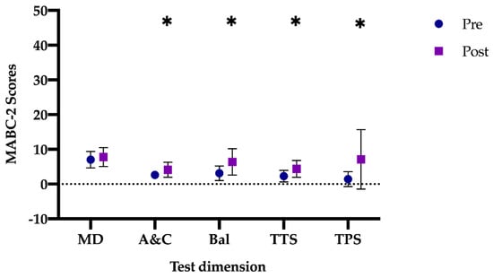 - Schoemaker, M.M.; Niemeijer, A.S.; Flapper, B.C.T.; Smits-Engelsman, B.C.M. Validity and reliability of the Movement Assessment Battery for Children-2 Checklist for children with and without motor impairments. Dev. Med. Child Neurol. 2012, 54, 368–375. [Google Scholar] [CrossRef]