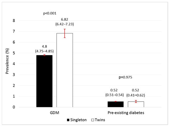 Among women with twin pregnancies, 14,785 (92.67%) were normoglycaemic, 1088 (6.82%) were diagnosed with GDM and 83 (0.52%) had pre-existing diabetes. Women with pre-existing diabetes included 63 (0.39%) with “type 2 diabetes mellitus and other pre-existing diabetes” and 20 (0.13%) with type 1 diabetes mellitus. The prevalence of GDM was higher in twin vs. singleton pregnancies whereas no differences were observed in pre-existing diabetes (Figure 1).